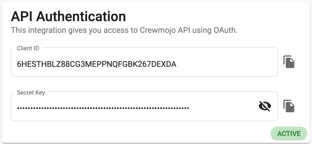 Once we have configured your API access, your Crewmojo Admin users will have access to the Client ID and Secret Key within Crewmojo.